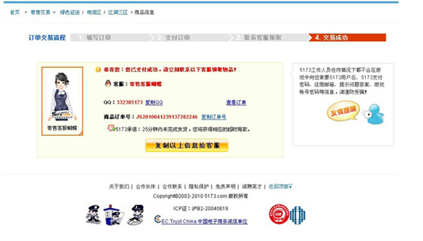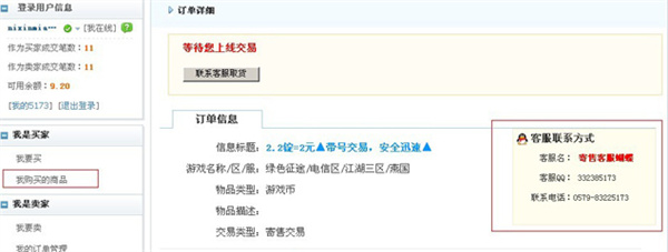二、登录5173帐号→我的5173→我是买家→我购买的商品中点击订单“详情”,即可查看客服的联系方式。