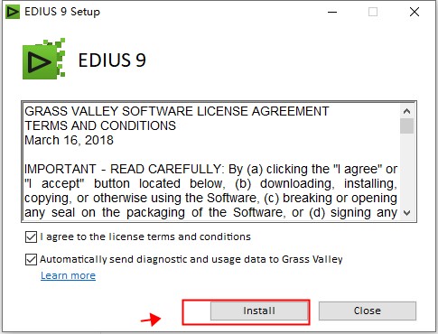 2、首先双击运行”EDIUS_Setup-9.20.3340.exe”程序,勾选软件协议,点击Install进行安装;