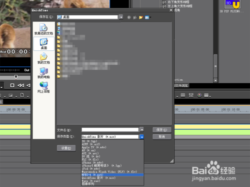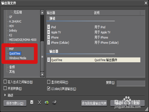 在输出到文件对话框中,在左侧找到我的预设选项,在全部中找到quicktime并选中。