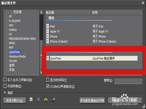 接着在右边输出器中选择quicktime输出插件选项,点击输出按钮。
