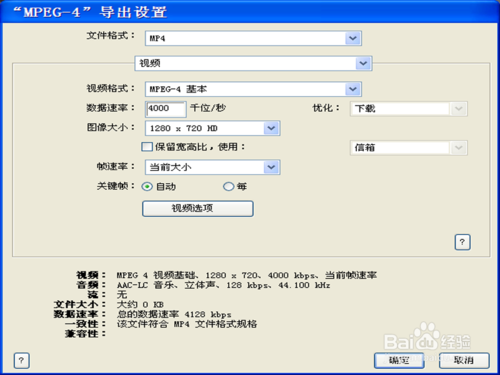 在mp4导出对话框中,设置文件格式为mp4,数据速率为4000,图像大小设置为1280*720hd,帧速率为当前大小,关键帧为自动,点击确定按钮。