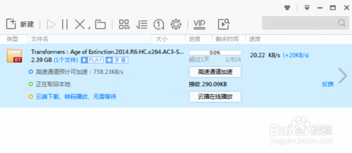 5、成功进入下载。BT文件一般下载速度较慢,离线空间预先载入得到改善,或者使用高速通道加速获得加速。