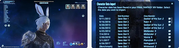启动角色创建工具时,您可以选择创建新角色或加载现有角色数据。这些数据也可以从 FINAL FANTASY XIV: A Realm Reborn 及其扩展包的基准测试中加载,以及游戏的测试版和零售版。