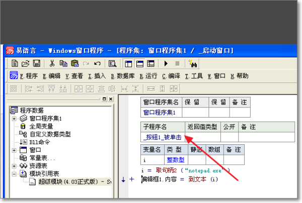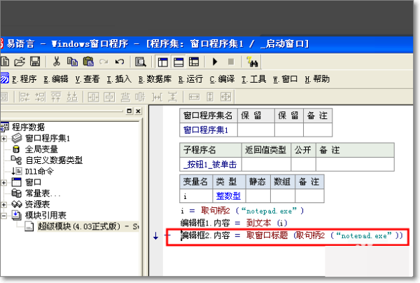 6、双击button1,在子例程“_button1_isclicked”下新建一个名为“I”的整数变量,然后编写如下代码:I=takehandle2(“记事本”)。编辑框1。Content=对文本的回答(I)。