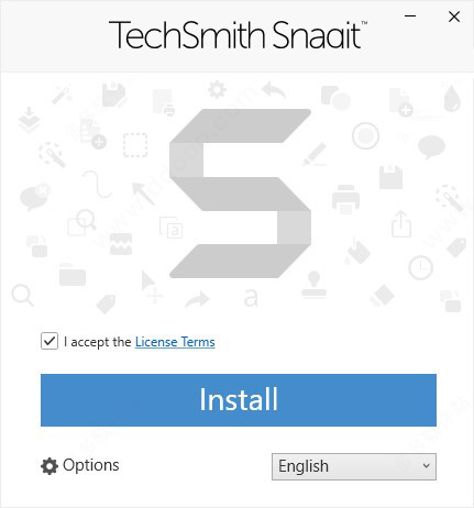 2、双击TechSmith_Snagit_2021.0.0.exe文件,勾上用户协议,点击options进入设置;