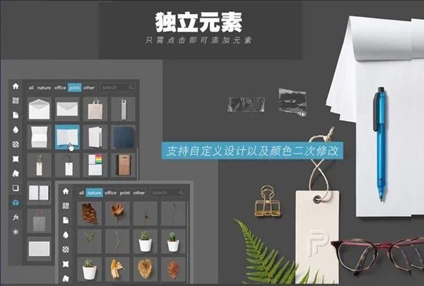 Paper Panel是一个Photoshop扩展插件,致力于创建样机模型,PS模板或其他场景。10 个主要选项类别彼此完美地对照,这使得使用此工具构建图像成为一项有趣而简单的任务。它包括各种选项,如物品、背景素材、铝箔/阴影叠加层等。这些脚本可通过面板界面分享,并点击添加到您的作品中,而自动调整图像边界等有用的脚本可加快工作流程。