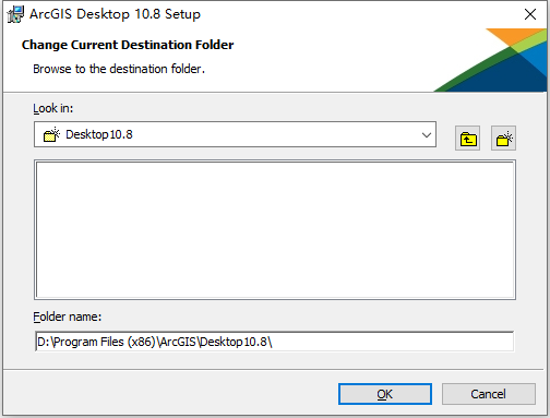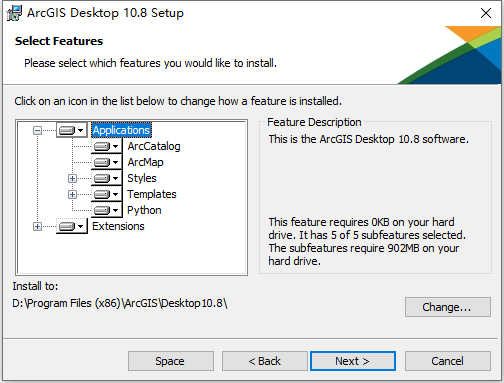 8、从上图看到,ArcGIS Desktop 10.8软件默认安装路径为C:\Program Files (x86)\ArcGIS\Desktop10.8,根据上图提示,我们点击“Change”选项修改软件的默认安装路径为D:\Program Files (x86)\ArcGIS\Desktop10.8,如下图所示: