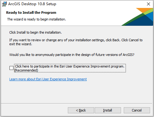 12、根据上图提示,我们取消勾选“Click here to participate in the ESRI User…”选项,然后点击“Install”即可开始安装ArcGIS Desktop 10.8软件,如下图所示: