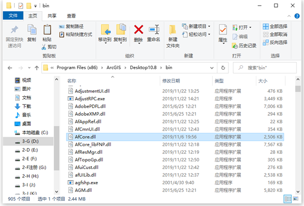 17、将Crack文件夹中的AfCore.dll文件复制后,粘贴到ArcGIS Desktop 10.8软件的默认安装路径D:\Program Files (x86)\ArcGIS\Desktop10.8\bin文件夹中替换同名文件,如下图所示: