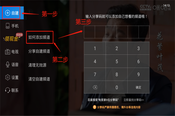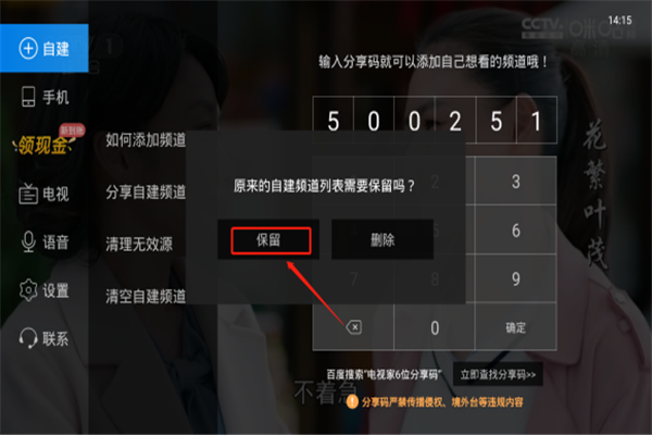 第二步:点击自建之后,输入获取的电视家6位分享码,点击确定即可。