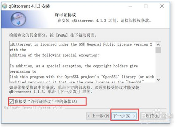 进入“许可证协议”窗口,阅读协议,在“我接受“许可证协议”中的条款(A)”前面单击鼠标左键,然后点击“下一步”。