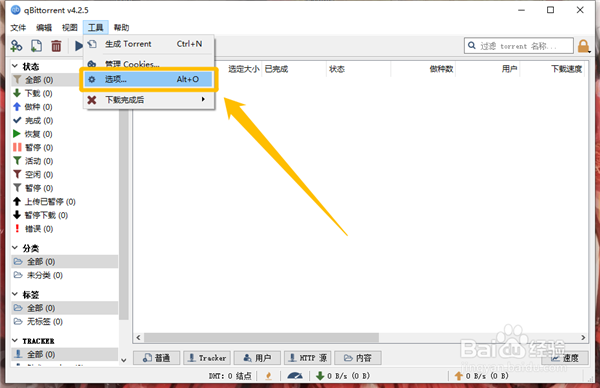 在“QBittorrent”主界面中,点击上方的“工具”选项卡。