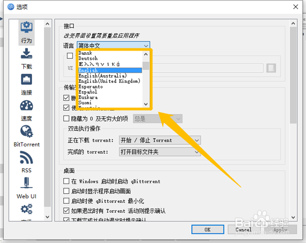 点击“语言”选项右侧的复选框后,在展开的下拉框中选择要使用的软件语言。