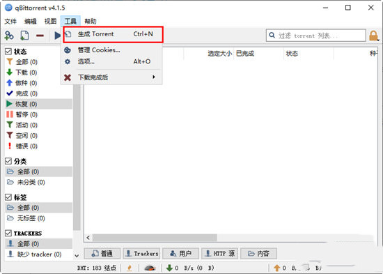 1、进入软件后,点击顶端工具栏中的“工具”,接着选择“生成 Torrent”选项,或者可以直接使用快捷键Ctrl+N。