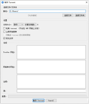 2、点击选择自己要发布的文件或文件夹,并且勾选“立即开始做种”选项,最后填写“Tracker网址”、“网络种子网址”以及注释等内容,最后点击底部的“制作 Torrent”按钮即可。