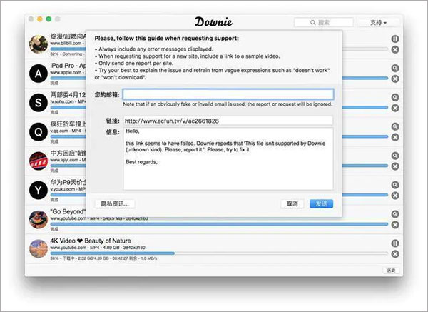 视频网站会不断更新代码,防止自家视频被轻易下载。如果您发现 Downie 对某些网站失效,可点击软件右下角的反馈按钮,将网站地址分享给开发商,方便他们及时跟进与处理。
