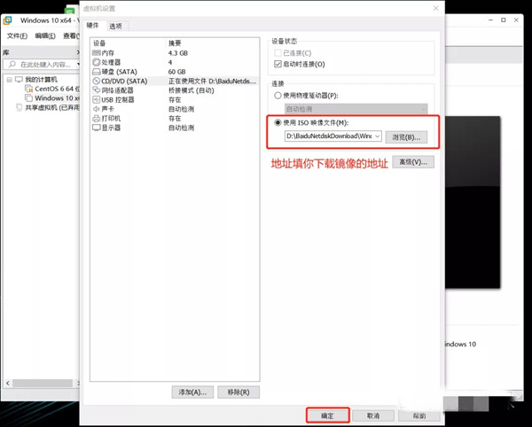 2、选择CD/DVD—>选择“使用ISO映像文件”这里把下载好的镜像路径填进去(镜像下载路径放在文末)然后点击确认即可