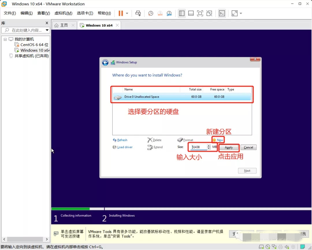 11、设置硬盘分区,选择硬盘—>选择新建分区—>填写分区大小—>点击应用 (如果您的电脑已经分好区的话跳过这一步即可)