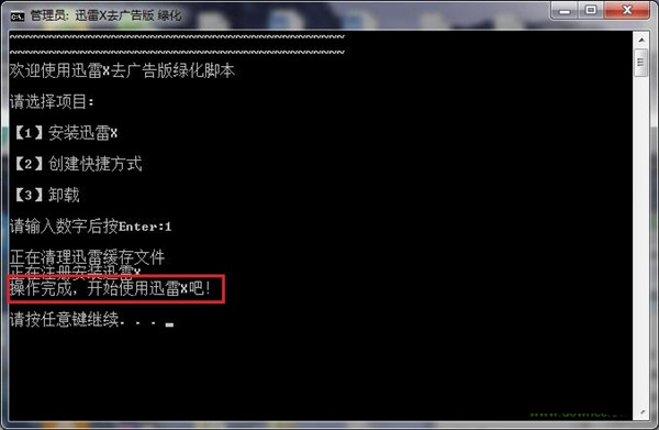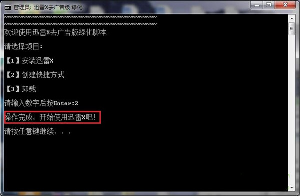 3、输入数字“2”,按“enter”,等待提示“操作完成,开始使用迅雷x吧!”,桌面就会生成迅雷的快捷方式,就可以开始使用了迅雷破解版,登录就是vip10。