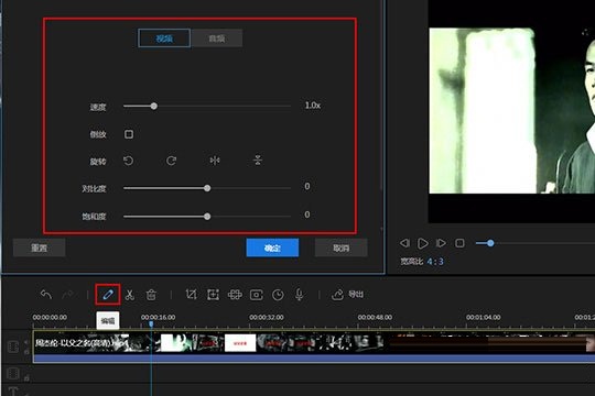 3、如果你想要对整个视频直接进行速度、倒放、旋转、对比度和饱和度的调整,则只需要双击时间轴中的视频,或点击红框标注内的“编辑”选项进行视频、音频的编辑;