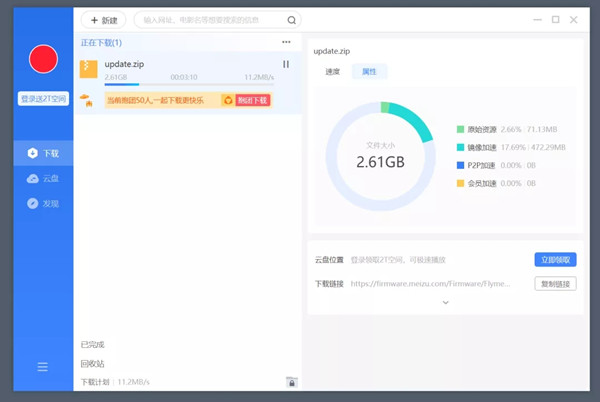 迅雷11的主界面分三大功能模块,下载、云盘、发现。下载文件时,可以灵活的选择将文件下载到电脑或者云盘。而且现在无论是否是会员,登录即可领取2T云盘空间。迅雷11是继迅雷X之后的换代版PC迅雷客户端。 在迅雷11上我们重新设计了主界面框架。