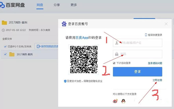 3、如果弹出窗口要求登录百度账户,下图1的位置输入你的百度网盘账户,2的位置输入密码登录即可,如果从未注册过百度账号,点3的位置注册一个即可。