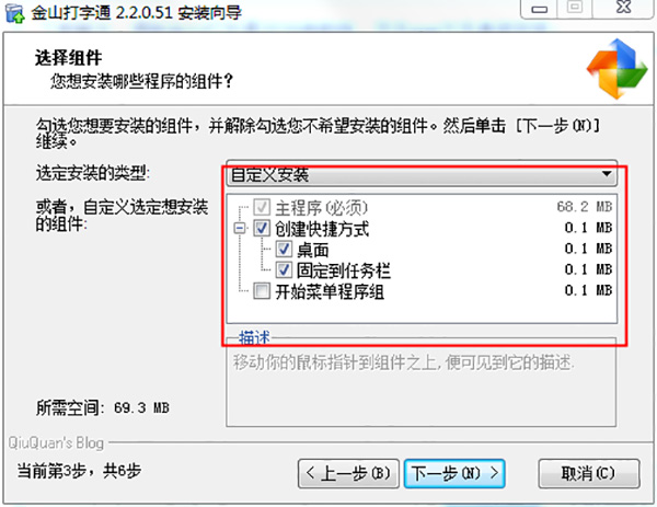 3、选择组件,可选择简洁安装也可以选择自定义安装,如果需要显示在桌面即打勾,如果不显示及不打勾,小编选择桌面,再点击下一步