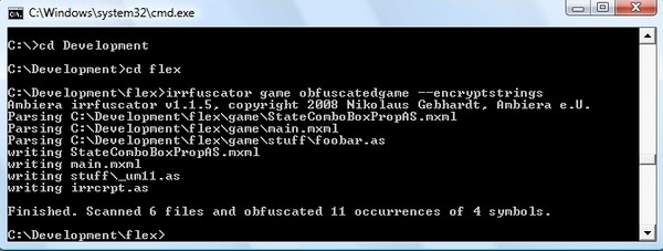 irrFuscator带有一个完整的命令行工具,它可以很容易地集成到IDE构建环境比如Flex Builder预处理步骤中,使用脚本,蚂蚁,makefile