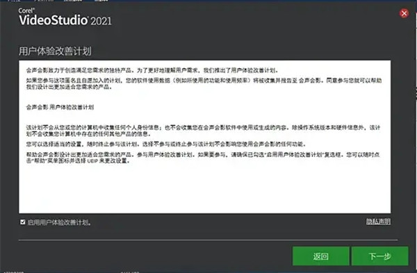 4、之后会出现中所示,用户体验改善计划,默认勾选“启用用户体验改善计划”,点击下一步;用户体验改善计划。
