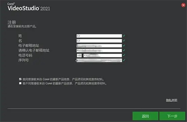 5、在安装前需填写注册信息,输入姓、名、购买邮箱电话等信息后,您可以选择是否想要收到来自官方的邮件或者不关注。然后点击下一步。注册产品。