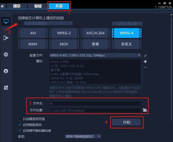 2、如果在制作视频前已经设置了项目属性,在“共享”界面勾选“与项目设置相同”的复选框,然后设置“文件名”和“文件位置”。