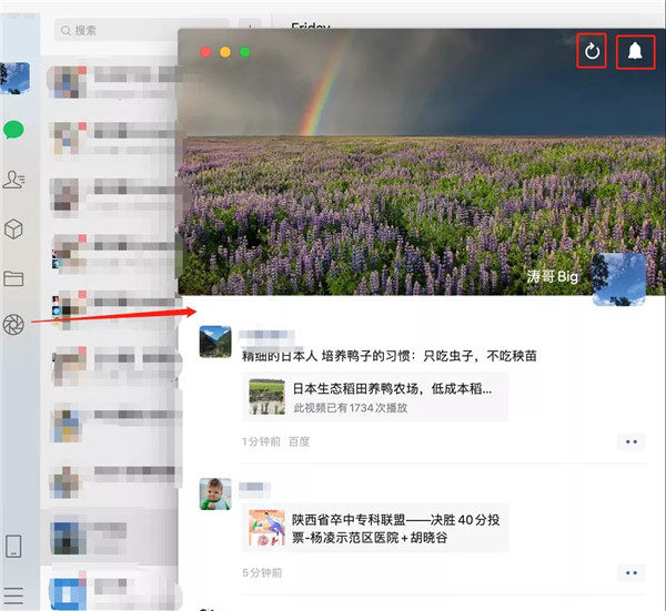 1、点击左侧朋友圈图标就会弹出朋友圈窗口,右侧刷新按钮可以刷新朋友圈,小铃铛按钮可以查看消息列表。