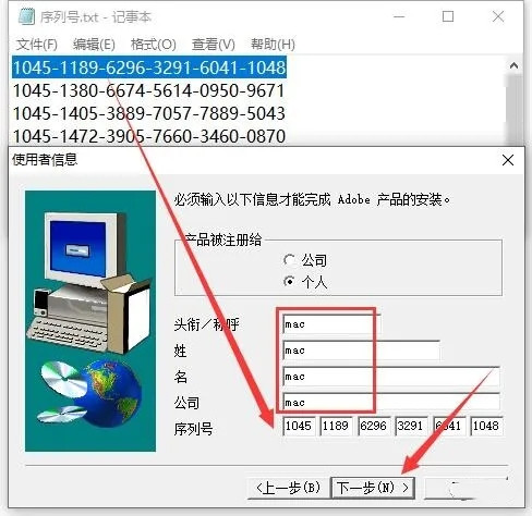 8.任意填写用户信息,将序列号复制粘贴到软件窗口中,点击下一步。