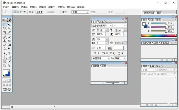 8、Photoshop桌面:Photoshop窗口的灰色区域为桌面。其中包括显示工具箱、控制面板和图像窗口。