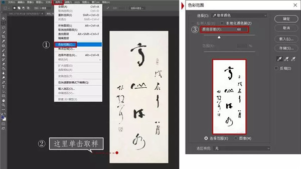 1、导入素材图,双击图层上的小锁解锁,依次单击菜单栏的“选择”——“色彩范围”,弹出色彩范围窗口,将鼠标在背景上单击一点取样,看着窗口中的预览调节颜色容差参数,目的是尽量让背景显示为白色,同时可以清楚的显示书法字、印章等素材,这里设置的颜色容差为60。