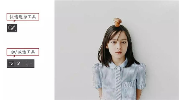 1、导入素材图,双击图层上的小锁解锁,左侧工具栏选择“快速选择工具“,结合左上方的加/减选工具,同时根据细节调节画笔大小,选出人物主体: