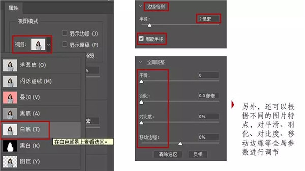 3、将视图模式改为白底,展开“边缘检测”选项卡,勾选“智能半径”,根据视图中的边缘效果调节半径大小,目的是让视图中的对象边缘看起来更加平滑和自然,这里我设置的半径参数为2像素,点击确定。