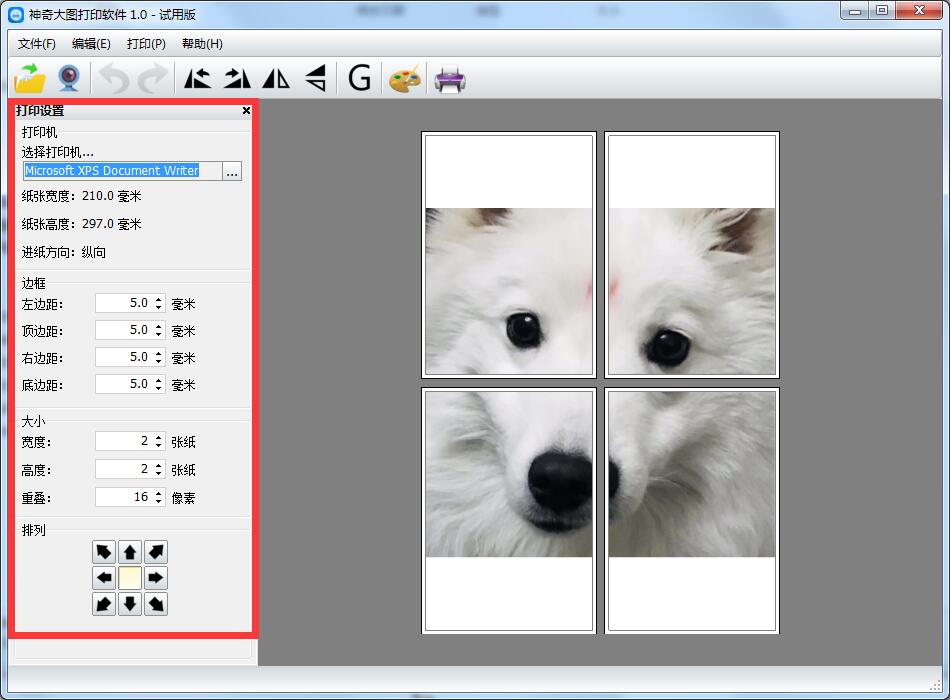 神奇大图打印软件是一款由北京神奇像素科技有限公司出品的较大图片打印工具。同时也是一款可以将单张图片拆分成任意数量的小图片的软件。图片经过拆分后再打印,在打印完成后再将图片按照原有的顺序排列起来即可实现一张大图的打印。操作非常简单,我们可以轻松完成大图打印的任务。在我们的平时生活中一般的打印机只能打印A3和A4的纸,你想打印一张图片,但如果说你的图片非常非常大,大到无法打印的时候我们该怎么办呢?这时候你就可以将这张大图制作成一个拼图,然后再打印多张A4纸,最后再把这些A4纸拼起来回复图片的原貌,这样就又是一张完整的图片了。我们在打印前还可以设置宽度、高度、重叠等参数,从而轻松完成大图打印