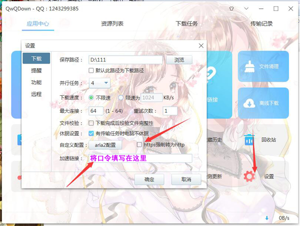 重启软件,打开设置,将口令填写在加速链接里,再开始下载。