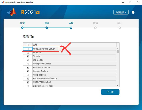 8、请取消选择组件 “ Matlab Parallel Server”,然后选择所需的组件安装,按照提示安装完成;