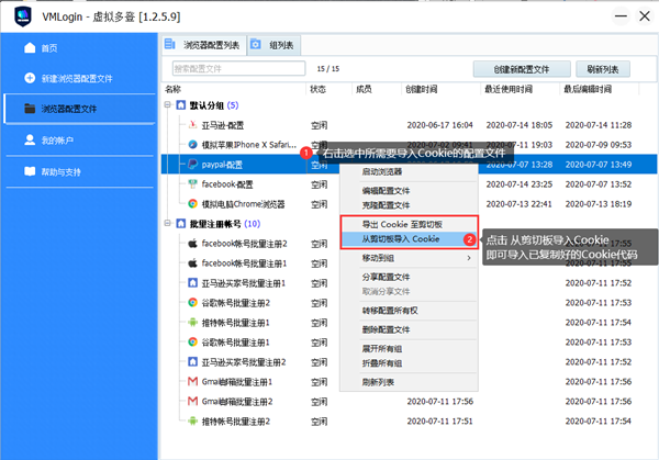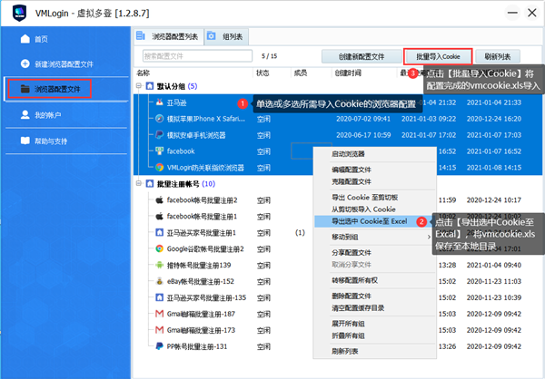 到VMLogin中,在浏览器配置文件栏里,右击选中所有导入Cookie的配置文件;