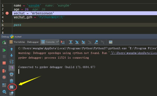 如果要调试以下简单的代码行。击中第三行的断点。然后在显示的位置单击ShowPython Prompt按钮。