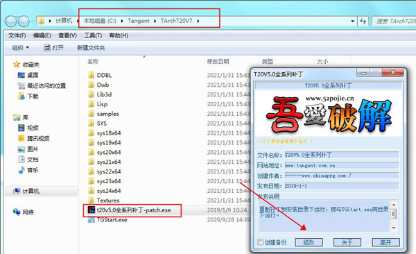 6、将Crack文件夹内的”t20v5.0全系列补丁-patch.exe”复制到软件根目录下并运行,点击修改即可