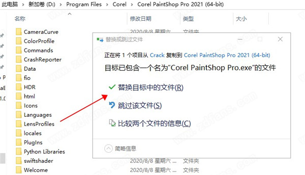 5、先不要运行Corel PaintShop Pro 2021,将破解补丁复制到软件安装目录下替换即可