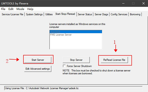 9、点击start/stop/read选项,点击 'rereadlicense file',再点击'start server'启动服务
