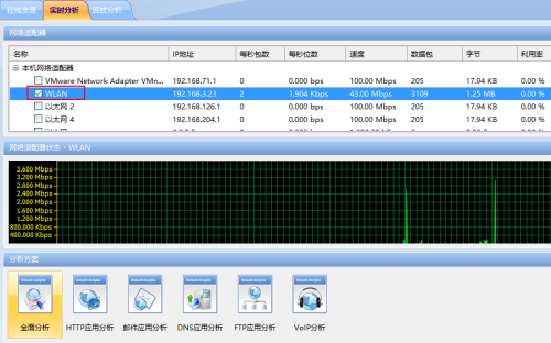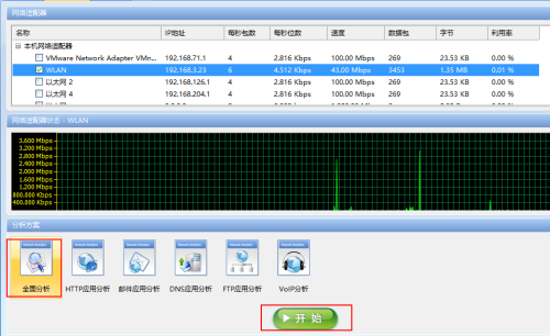 勾选网卡后,选中下面的“全面分析”选项,然后点击“开始”按钮。系统就开始自动抓包分析了。
