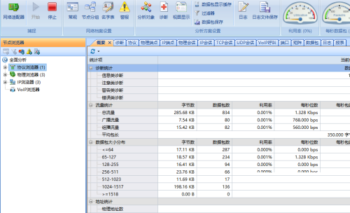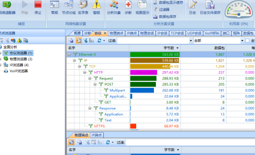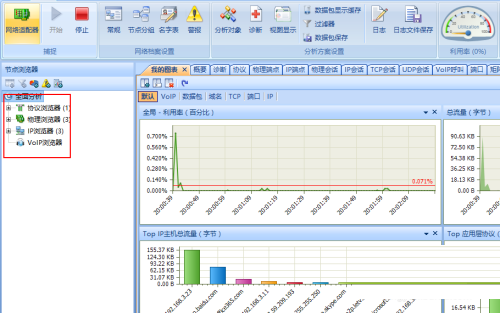 在分析的主界面,分为“协议浏览器”、“物理浏览器”、“IP浏览器”、“VoIP浏览器”四部分。