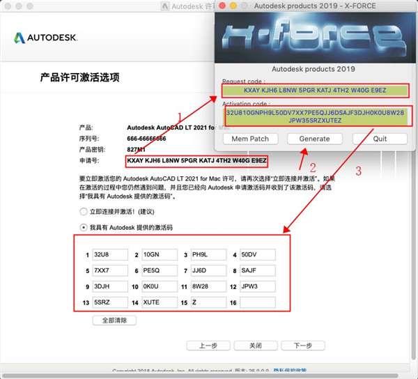 15、进入Crack文件下,双击加载xf-adesk19.dmg,并运行其中的注册机,点击注册机当中的Mem Pacth,会出现成功的标识