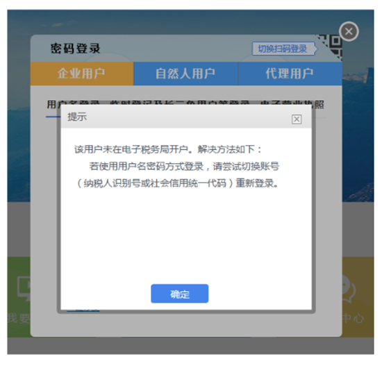 注意:身份选择的同时也是对电子税务局用户和密码的校验,若用户名密码输入错误,选择身份后会弹出相应的提示信息。