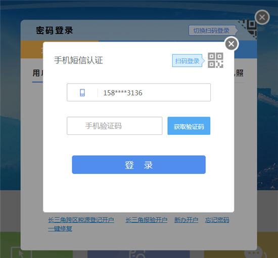 (3)用户名密码输入正确,且身份人员选择后,会弹出手机短信登录验证界面,点击“获取验证码”,输入验证码验证通过后登录办理涉税事项。